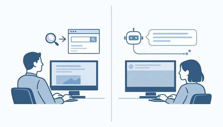 Lo que subyace al GEO es un cambio radical y muy profundo en el comportamiento de las personas usuarias. Durante muchos años, buscar información en internet ha consistido típicamente en introducir los términos de búsqueda en el buscador (Google), analizar los primeros resultados que nos devuelve el motor de búsqueda y entrar en una o varias webs. Casi siempre hay, al menos, un clic. El buscador actúa como un intermediario que te lleva a otro sitio donde se encuentra la información. Este modelo de comportamiento no ha desaparecido, sigue existiendo, pero cada vez se está popularizando más otro modelo diferente. En lugar de buscar en Google le preguntamos directamente a la IA. Y la IA nos proporciona directamente la información que necesitamos. ChatGPT responde directamente. Google responde directamente (Google AI Overviews). El usuario no abandona el chatbot. No termina en ninguna web. Es lo que se conoce como el fenómeno zero-click.
